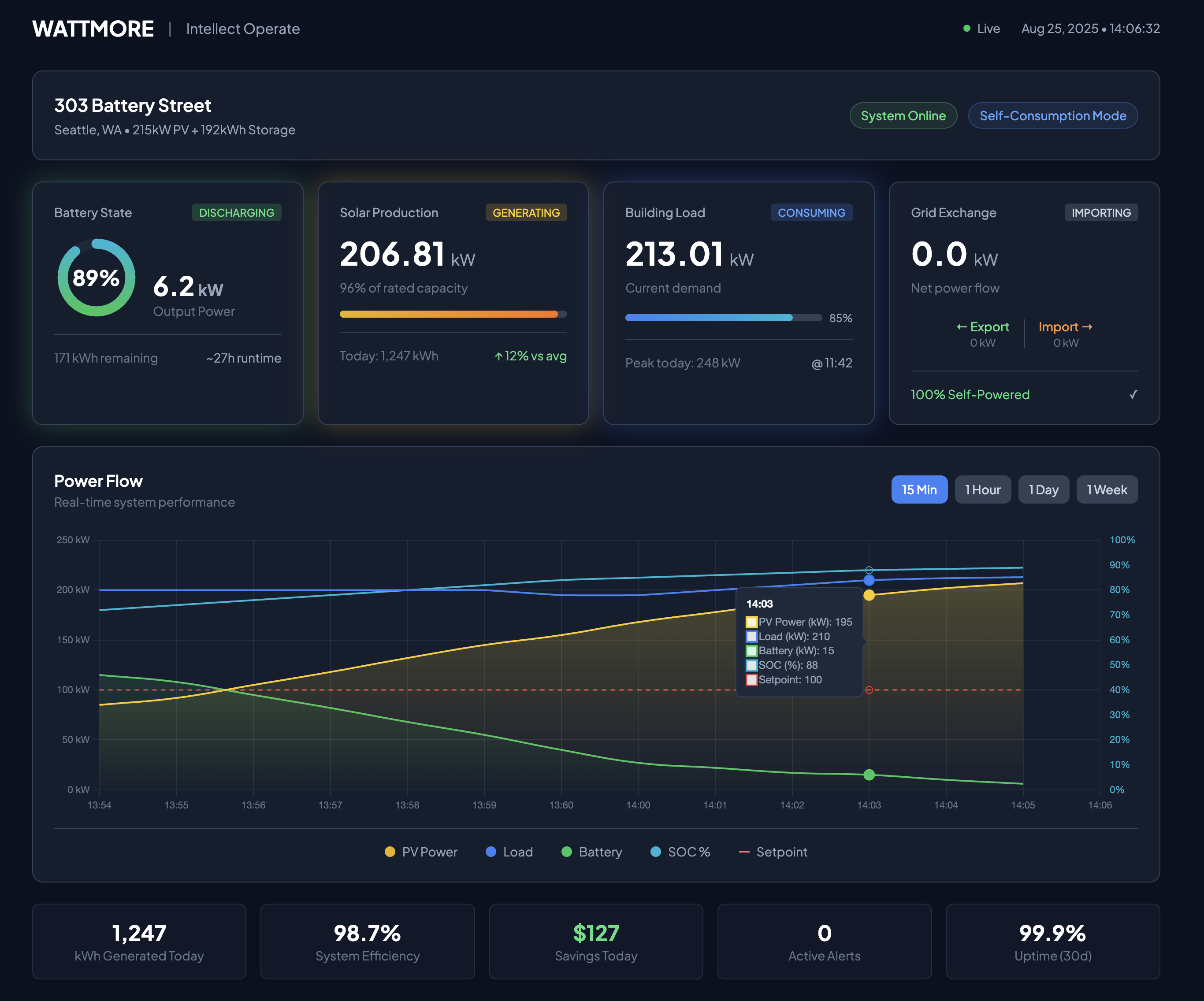 WATTMORE's Intellect Operate is a storage EMS built by a team that operates real battery systems every day. It combines edge-based real-time dispatch with cloud analytics and AI-powered optimization. It is vendor-agnostic, supports all major battery and inverter manufacturers, and has been proven across hundreds of megawatts of deployed storage.